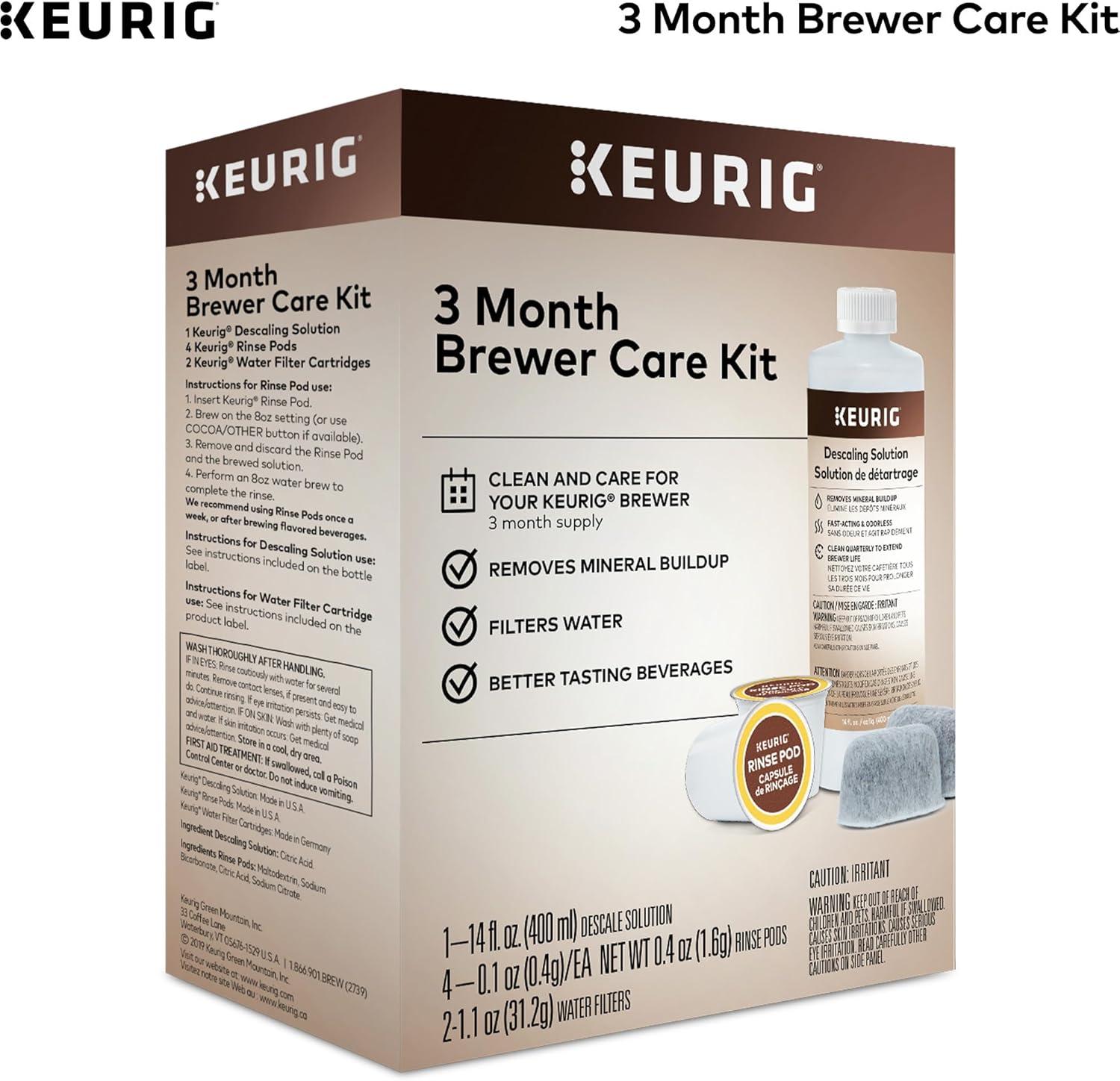 Cleaning your coffee maker regularly is an important step to extend the life of your brewer and keep your beverages tasting their best. The 3 Month Brewer Care Kit has everything you need to regularly clean and maintain your brewer for 3 months. The Keurig 3 Month Brewer Care Kit includes 1 bottle of Keurig Descaling Solution, 2 Water Filter Cartridges, and 4 Keurig Rinse Pods. The 3 Month Brewer Care Kit is compatible with all Keurig coffee makers. If you have a Keurig K-Mini or K-Mini Plus brewer, we recommend that you consider our Keurig Cleanse Kit which only includes Keurig Descaling Solution and Keurig Rinse Pods as the K-Mini brewers do not use Water Filter Handles.