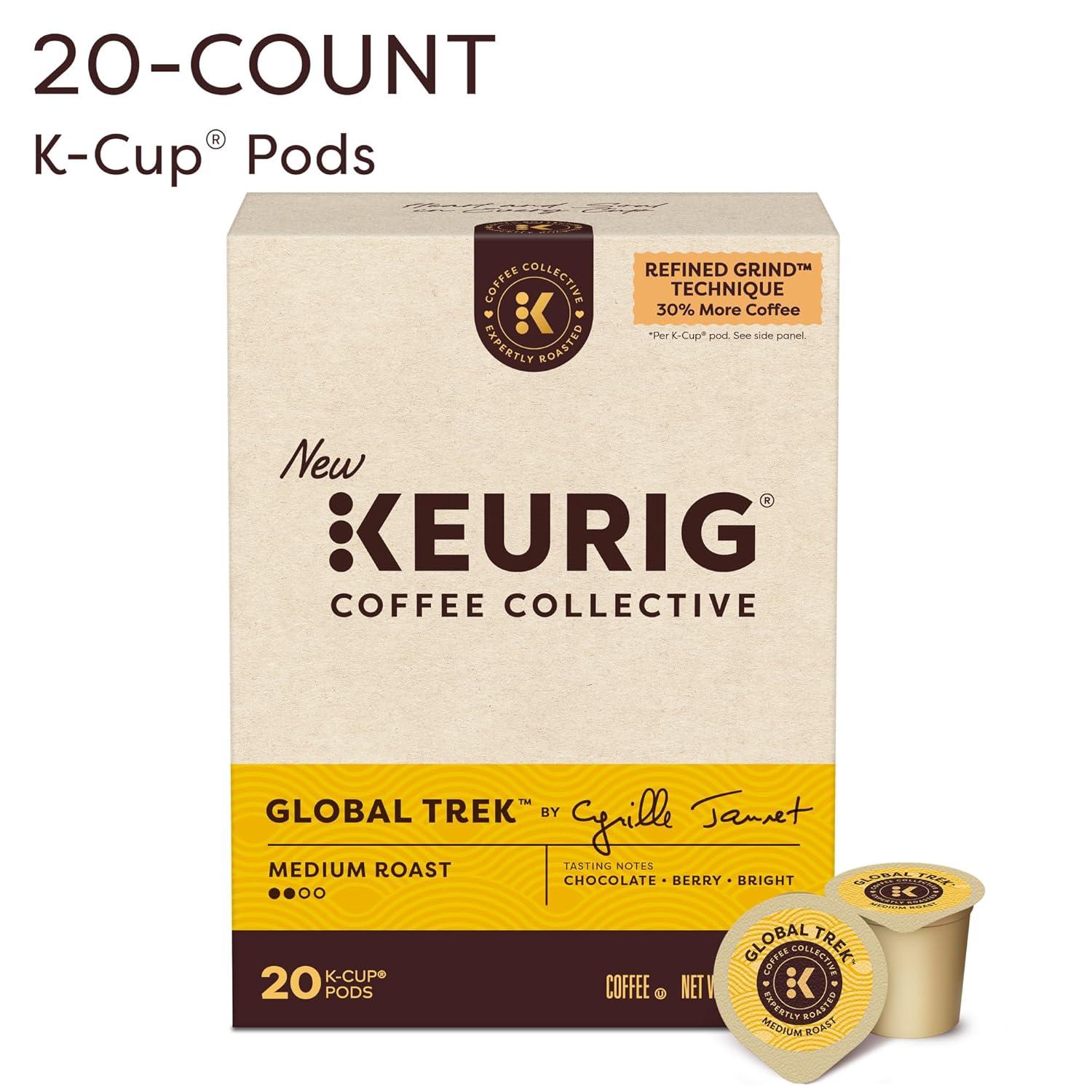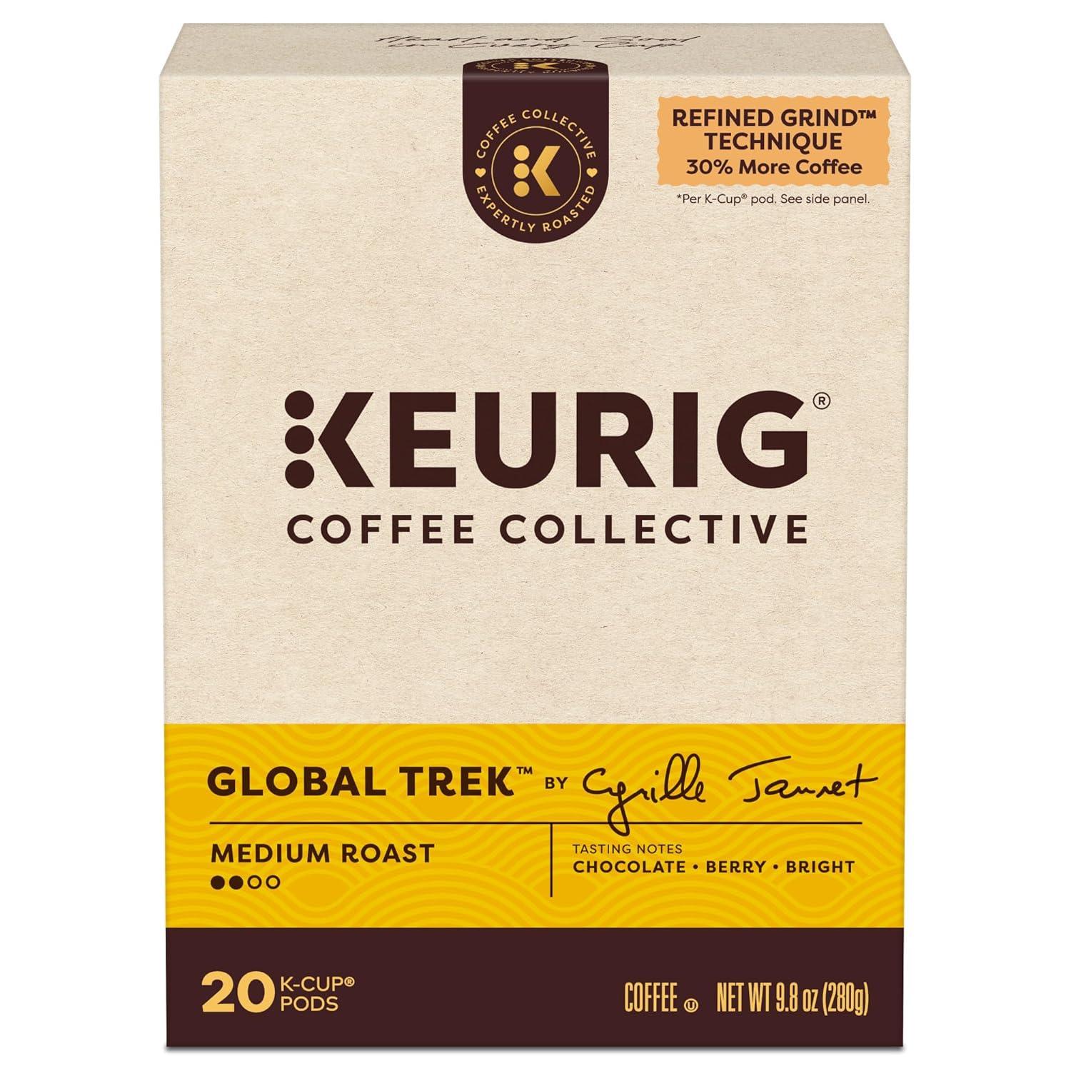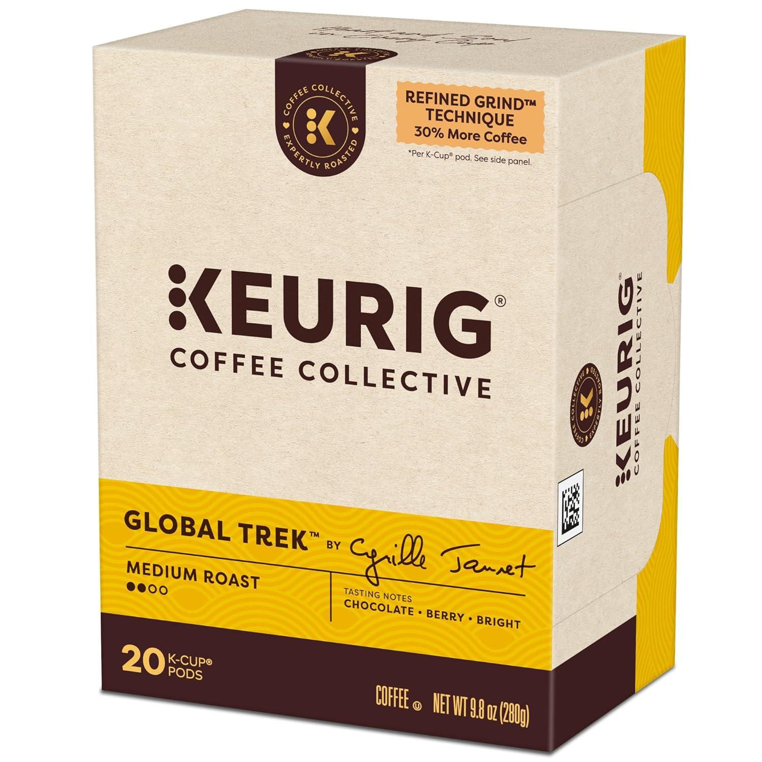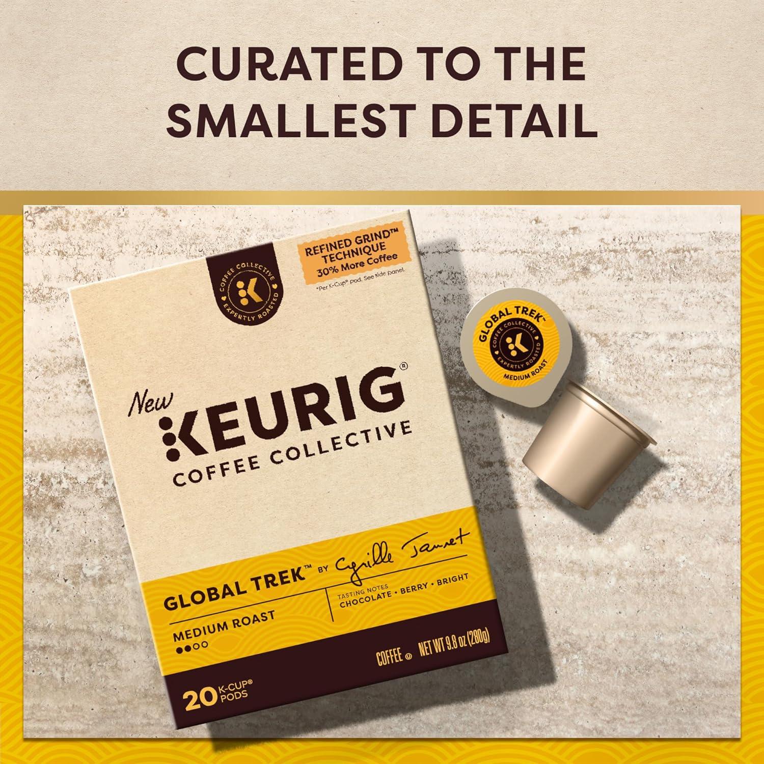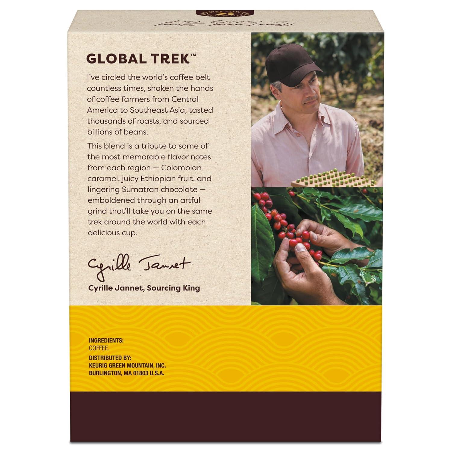 Take a journey with every sip of Global Trek by Cyrille Jannet, a medium roast coffee with bright notes of chocolate and berry. As one of the signature flavors from our Keurig Coffee Collective, Global Trek is part of a collaboration of trailblazers who have brought their unique flavor and perspective to every cup. Sourcing King Cyrille Jannet has traveled the world's coffee belt countless times, tasted thousands of roasts, and sourced billions of beans. Global Trek is a tribute to some of the most memorable flavor notes from each region — Colombian caramel, juicy Ethiopian fruit, and lingering Sumatran chocolate — emboldened through an artful grind that'll take you on the same trek around the world with each delicious cup. Keurig Coffee Collective also introduces the Refined Grind Technique, a new technique that grinds premium beans to a high density, allowing us to pack 30% more coffee grounds into each K-Cup pod* — so you can enjoy this distinctively delicious coffee in every cup. *Based on the average weight of coffee in a Keurig K-Cup pod.