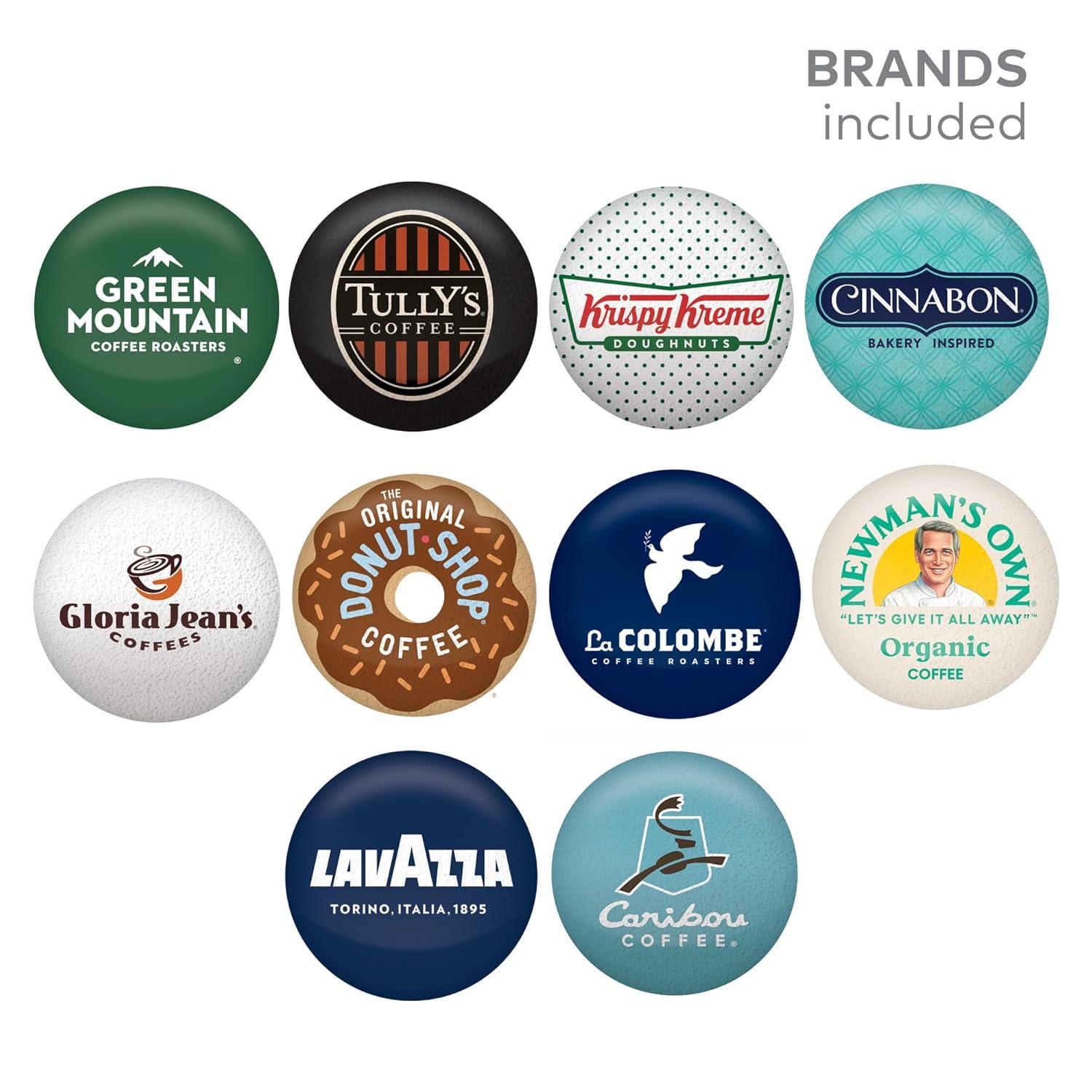 Indulge your taste buds with this exciting collection of our favorite flavored light and medium roast coffee varieties, all together in the Keurig Flavored Coffee Collection. This variety pack includes 40 K-Cup pods spanning 10 different varieties from six of your favorite brands. Try something unexpected and discover the delicious possibilities of Keurig within. The Keurig Flavored Coffee Collection includes four K-Cup pods each of: Caribou Coffee Caramel (flavored medium roast) Cinnabon Classic Cinnamon Roll (flavored light roast) Gloria Jean’s Coffees Butter Toffee (flavored medium roast) Gloria Jean’s Coffees Hazelnut (flavored medium roast) Gloria Jean’s Coffees Raspberry Chocolate Lava (flavored medium roast) Green Mountain Coffee Roasters Caramel Vanilla Cream (flavored light roast) Green Mountain Coffee Roasters French Vanilla (flavored light roast) McCafé Baked Apple Pie (flavored light roast) The Original Donut Shop Coffee Duos Coconut + Mocha (flavored medium roast) The Original Donut Shop Coffee Duos Nutty + Caramel (flavored medium roast) Each K-Cup pod is filled with freshly ground coffee beans and is compatible with all Keurig single serve coffee makers. Simple. Delicious. And recyclable.* Enjoy the same great-tasting coffee you know and love, and when you’re done, just peel, empty, and recycle.*Check locally, not recycled in many communities.